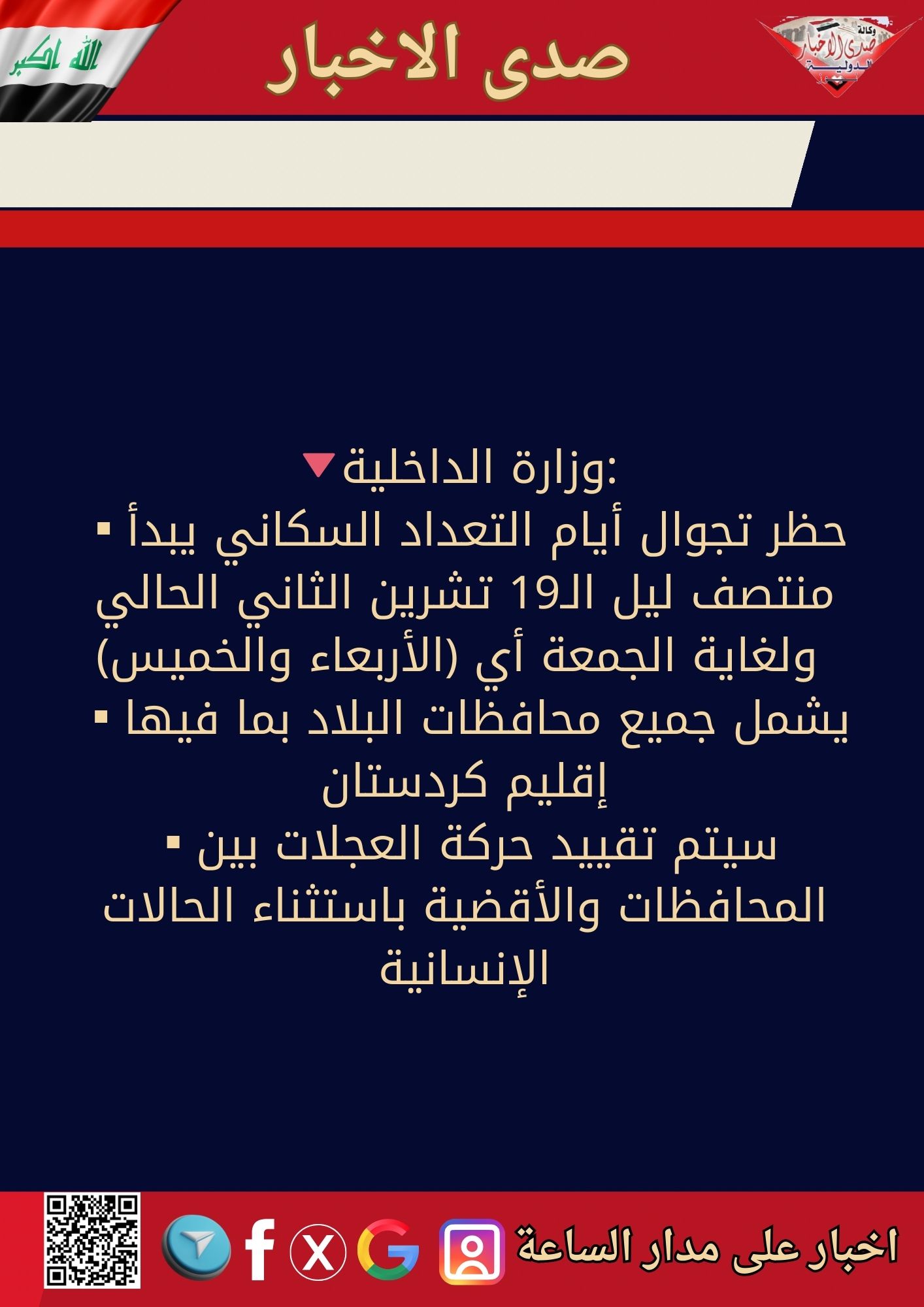 🔻وزارة الداخلية: ▪️حظر تجوال أيام التعداد السكاني يبدأ منتصف ليل الـ19 تشرين الثاني الحالي ولغاية الجمعة أي (الأربعاء والخميس) ▪️يشمل جميع محافظات البلاد بما فيها إقليم كردستان